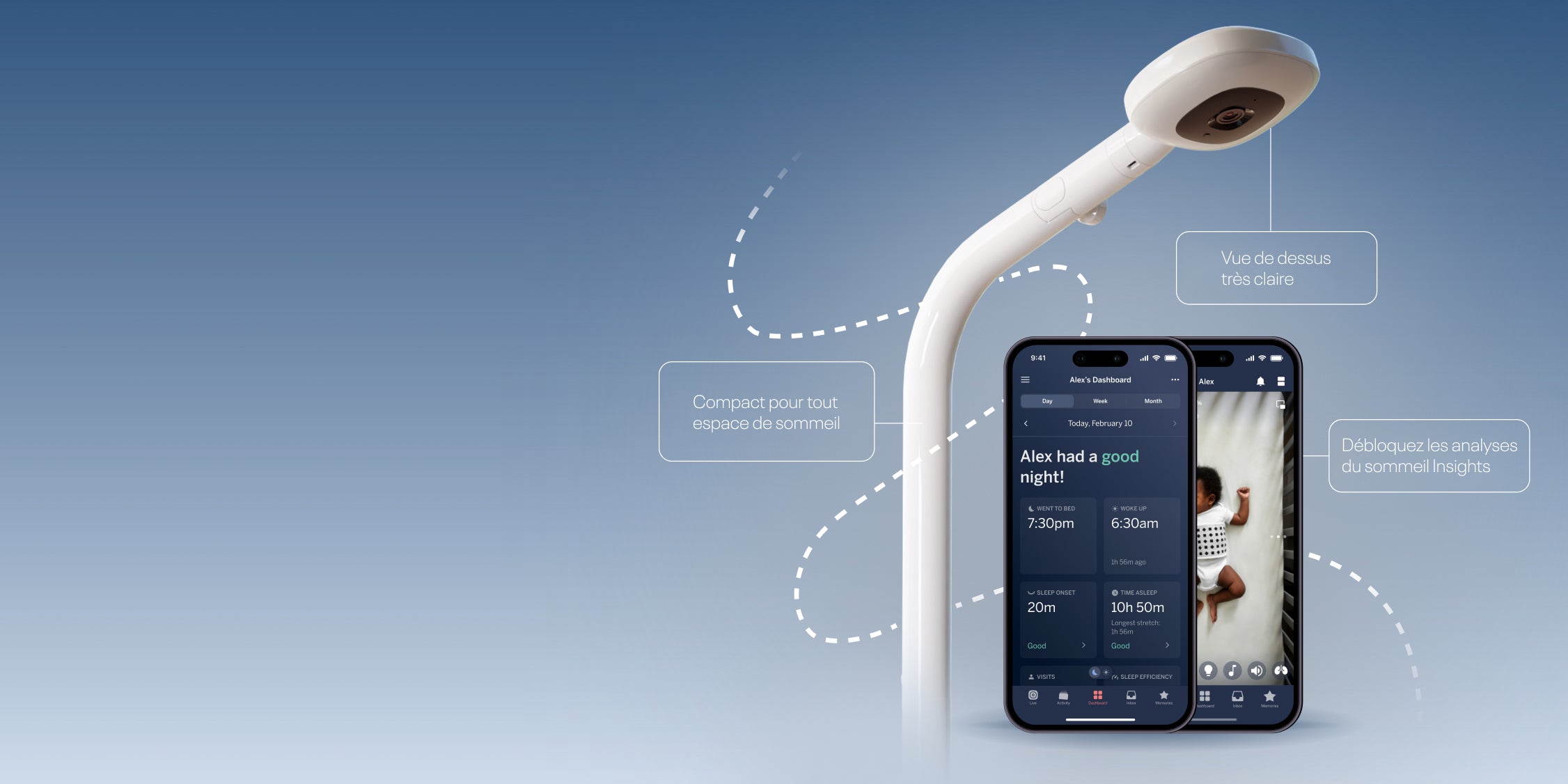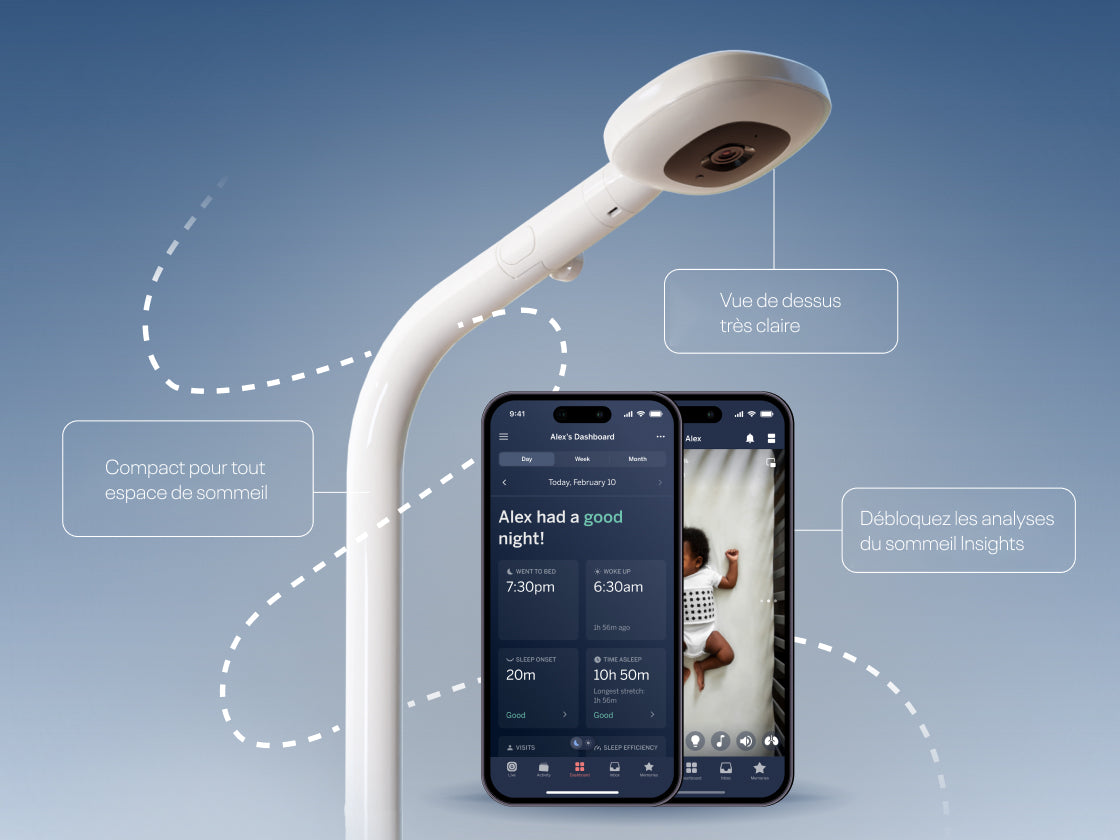 Notre puissante Caméra Pro + plan Insights suit 14 points clés de données, afin que vous puissiez savoir quand, où et comment votre enfant dort le mieux. Complétez la surveillance avec nos vêtements pour la respiration exclusifs pour suivre le mouvement respiratoire.